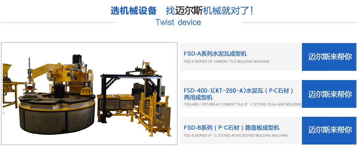常熟市邁爾斯機械有限公司是一家集研發(fā)、生產、銷售于一體的建材機械高科技企業,其前身為2011年注冊創(chuàng)辦的“常熟市虞山鎮豐順達機械配件廠”,經過多年的努力,于2017年注冊成立“常熟市邁爾斯機械有限公司”,專業生產模壓水泥彩瓦機、P.C石材機、轉盤式成型機、彩色路面磚機等綠色建材設備。公司以市場為龍頭,以技術為導向,開發(fā)了系列化、標準化的適銷對路的機械產品,并且注冊了多項國家專利技術,銷售范圍覆蓋全國,并且出口越南、老撾等東南亞和其它國家。